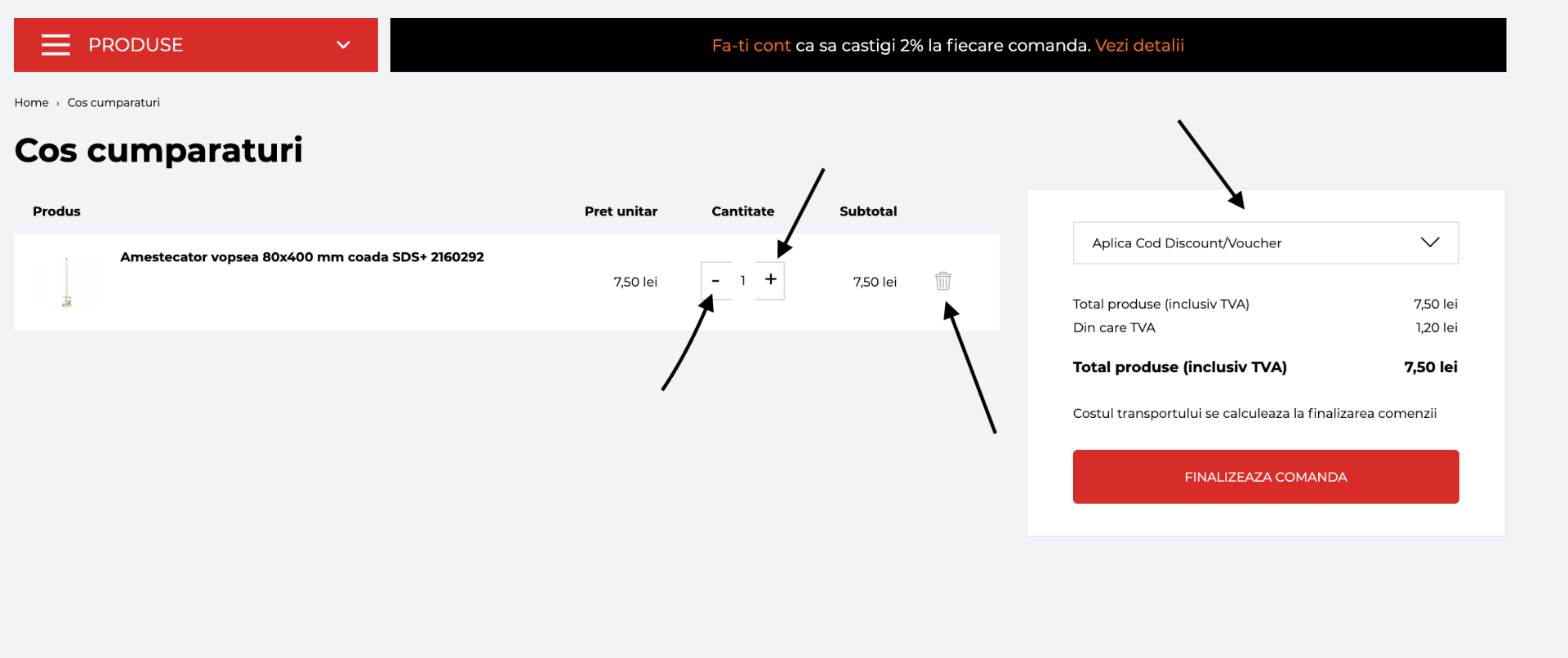 Veți ajunge în pagina coșului de cumpărături unde aveți posibilitatea să modificați sau să ștergeți produsele alese. Tot aici aveți posibilitatea să introduceți un cod de reducere dacă ați primit unul.